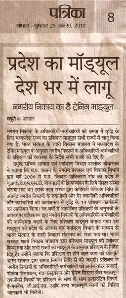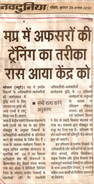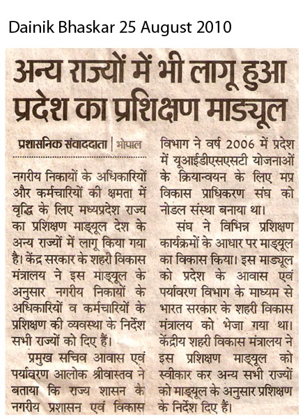| State Institute for Town Planning (formerly known as MPVPS) was State Level Nodal Agency for UIDSSMT Schemes from 2006 to 2010. During this period, Madhya Pradesh Vikas Pradhaikaran Sangh organise 14 different training programmes for Urban Local Body Officers/Officials.In 2009, State Institute for Town Planning (formerly known as MPVPS) prepared a training module for Urban Local Bodies under UIDSSMT Schemes and sent it to Government of India, |